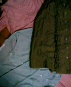 赤×白ストライプのコットンワンピース(羽織りものにも使えるし、薄地だけどペチコートが付いてるので一枚でも着れるv)、カーキのフレアスカート(フリルも可愛いけど技アリは前ボタン全開できるとこ。別のスカート着た上からオーバースカートにも出来まーす)、水色のシフォン素材ブラウス(一見地味だけどレースとピンタックが可愛い〜vv)の3点お買い上げ。
